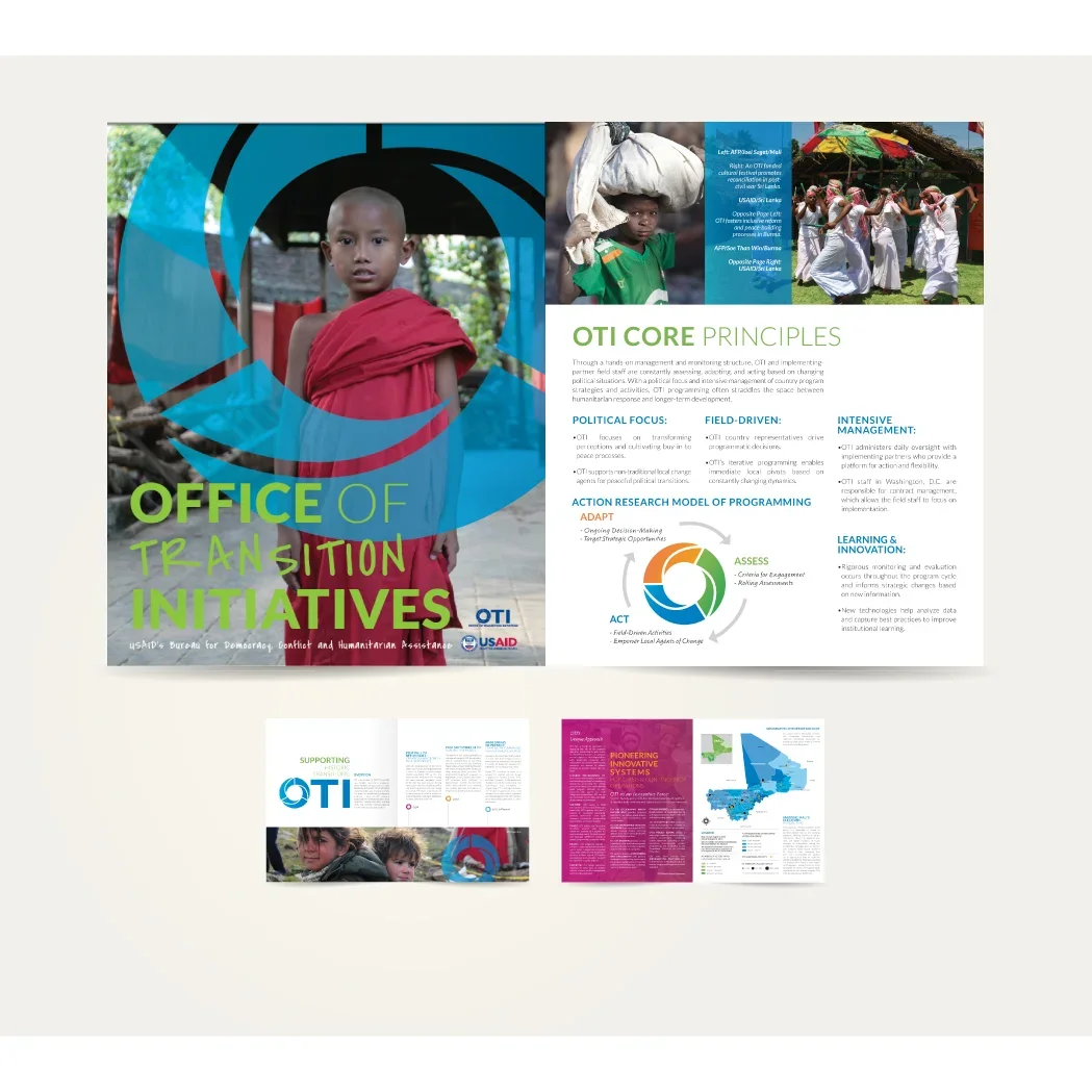 Visual identity and design support for USAID/OTI to enhance the office's identity, improve clarity of complex geospatial materials, and create interactive public outreach products over five years. Beginning with the core visual mark (three-part ring), I led the visual identity development and upskilling of the GIS team on design best practices, and partnered with the media specialist to create outreach and info products.