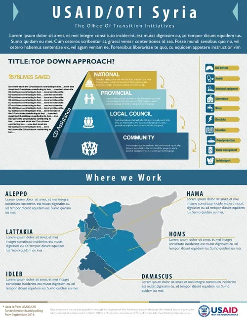 Graphic Designer for the Office of Transition Initiatives, focused on setting the office's core visual identity, applying design principles to enhance the clarity of complex geospatial and public outreach materials.